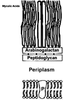 There is one other cell wall component that we have not yet discussed which is a very important aspect of mycobacteria.  Mycobacteria have a similar cell wall to gram-positive bacteria, but in addition, they have an outer leaflet that contains mostly mycolic acids.  Mycolic acids are long chain fatty acids that are covalently linked to an "arabinogalactan" polysaccharide layer.  The polysaccharide layer is in turn linked to the underlying peptidoglycan structure.  Mycolic acids provide a formidable barrier against most antibiotics and are essential for bacterial viability.11  Antibiotics that affect mycolic acid stability are key to fighting mycobacterial infections.