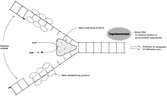 The act of separating the strands of DNA causes a "supercoiling" tension downstream from the replication fork.  Unchecked, this tension would quickly increased and eventually prevent further progression of the replication fork.  However, another group of enzymes, the topoisomerases introduce "swivel" points along the double helix to release the "supercoiling" tension caused by the uncoiling of the helical DNA.  This supercoiling phenomenon can be demonstrated by tying two ends of a rope together, twisting them to form a double-helix, and then pulling them apart in the center.  The twists in the rope on either side of the separation will twist more and more until they greatly limit further separation of the two ropes in the middle.  DNA topoisomerases come in different types.   Type I topoisomerases, also called DNA swivelases, reversibly cuts a single strand of the double helix thereby allowing the cut strand to swivel around the uncut strand to relieve the built up tension on the two strands.  After the swiveling has released the tension, the swivelase enzymes can reseal the cut.  Therefore, swivelases have both nuclease (strand-cutting) as well as ligase (strand-resealing) activities.  They do not require ATP but rather store energy from the phosphodiester bond that they cleaved and use the stored energy to reseal the strand.  Type II topoisomerases, also called DNA gyrases, bind tightly to both strands of the DNA and make transient breaks in both strands of the DNA helix.  The enzyme then causes a second stretch of the DNA double-helix to pass through the break and finally reseals the break.  The result is a "negative supertwist" that allows easier unwinding of the DNA double-helix.12