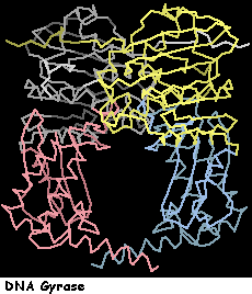 Fluoroquinolones (ie: ciprofloxacin) are synthetic antibiotics that target both DNA gyrases as well as topoisomerases (type "IV").   The gyrases are heterotetramers (A2B2) whose subunits are encoded by the gyrA and gyrB genes.  Topoisomerase IV is also a heterotetramer composed of distinct subunits called ParC and ParE.  ParC is a homologue of gyrA while ParE matches gyrB.  Specifically, topoisomerase IV is the main enzyme that removes the linking of daughter chromosomes after a round of DNA replication (allows cellular segregation to occur).19