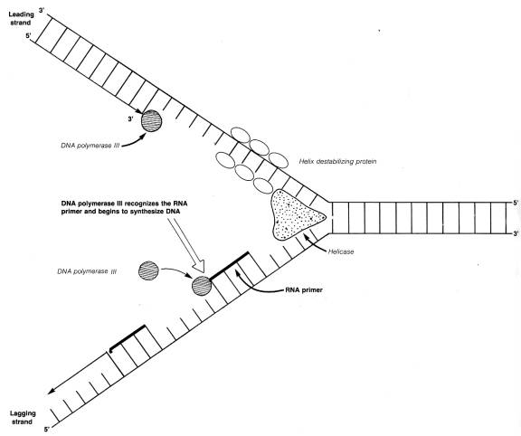 Once the primosome is formed on the parent strand of DNA, DNA chain elongation can begin via the catalytic activity of DNA polymerase III.  DNA polymerase III first recognizes the 3' hydroxyl group of the RNA primer as the acceptor of the first deoxyribonucleotide.  Of course, from this starting point DNA chain synthesis proceeds in the 5' to 3' direction "antiparallel" to the parental strand, which is read in the 3' to the 5' direction.  All four deoxyribonuceoside triphosphates (dATP, dTTP, dCTP, and dGTP) must be present in sufficient quantities for DNA elongation to occur.  If one of the four is in short supply, DNA synthesis will fail.